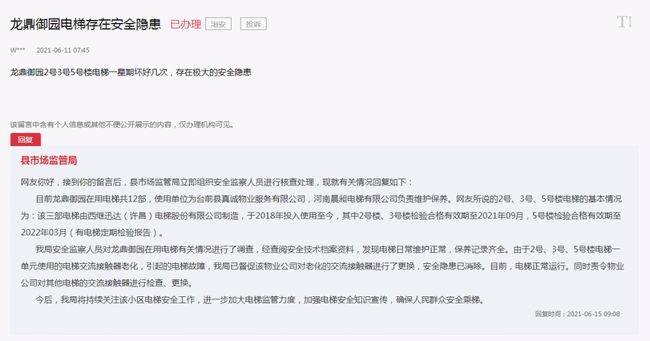 嚇人!濮陽這個(gè)小區(qū)的電梯故障頻出,到底咋回事? W*** 2021-06-11 07:45 龍鼎御園2號(hào)3號(hào)5號(hào)樓電梯一星期壞好幾次,存在極大的安全隱患 該留言中含有個(gè)人信息或其他不便公開展示的內(nèi)容,