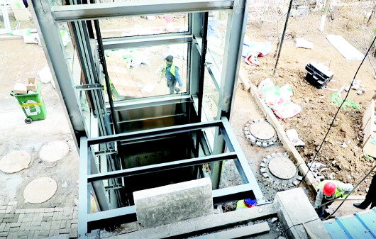 加裝電梯施工現(xiàn)場。 本報(bào)3月9日訊(半島全媒體記者朱佳鑫) 老樓加裝電梯,如今在青島已經(jīng)不是新鮮事了,可是在市北區(qū)福嶺嘉苑小區(qū),一座15“歲”堪稱正青春的居民樓,有個(gè)單元卻成功加裝了電梯