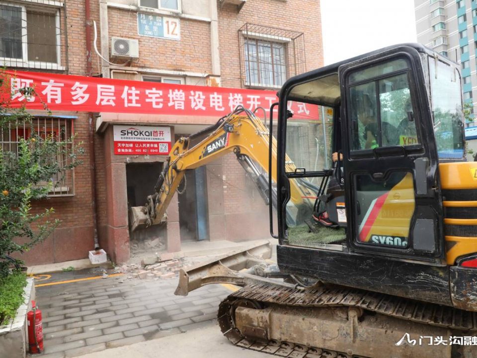 在老舊小區(qū)中,住在高層的老年人上下樓非常不方便。對(duì)于這些老年人來(lái)說(shuō),加裝電梯就顯得尤為迫切。8月6日,大峪街道月季園東里社區(qū)成為了門(mén)頭溝區(qū)首個(gè)加裝電梯的老舊小區(qū)。 施工現(xiàn)場(chǎng),挖掘機(jī)正在對(duì)樓道外墻體進(jìn)行