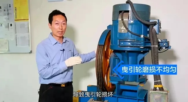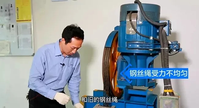 還有一個(gè)原因就是,如果我們只更換一根鋼絲繩,那么就會(huì)導(dǎo)致鋼絲繩在受力的時(shí)候不均勻,因?yàn)樾碌匿摻z繩和舊的鋼絲繩張力是不一樣的,就像我手里面的皮筋。新的鋼絲繩延伸性比較好,舊的鋼絲繩延伸性就很差,那么這個(gè)時(shí)候就會(huì)導(dǎo)致曳引輪磨損不均勻,那么最終的結(jié)果是導(dǎo)致曳引輪損壞。