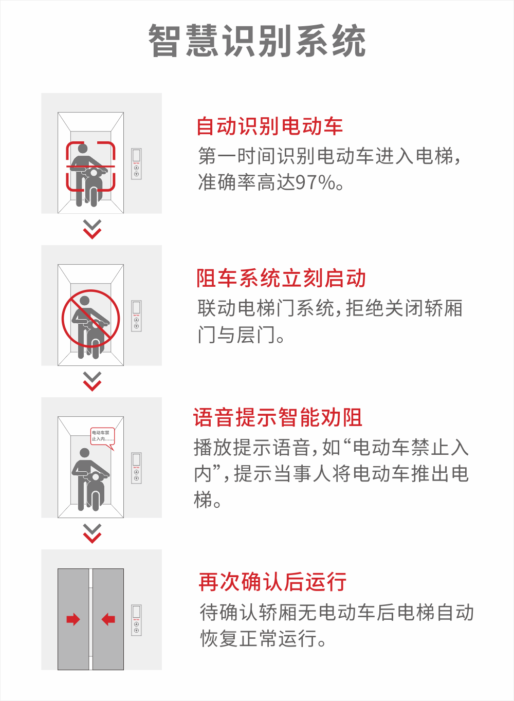 火患猛于虎,電動(dòng)自行車禁止入樓入戶,這不僅是對自己,也是對別人的生命負(fù)責(zé)。電動(dòng)車一旦自燃著火,不僅溫度急速提升,同時(shí)還會(huì)伴隨大量有毒濃煙,極易引發(fā)傷亡事故?,F(xiàn)在全國各地都在嚴(yán)抓的同時(shí),還建議為電梯安裝“智慧識別系統(tǒng)”,可作為保障業(yè)主生命財(cái)產(chǎn)安全的又一道堅(jiān)固防線。